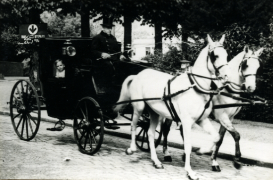 Zur Kirche ließ sich das Brautpaar auf besonderen Wusch von Karin per Kutsche fahren. Aus dem Kutschenfenster guckt ein Nachbarjunge, der zusammen mit der Tochter der früheren Haushaltshilfe die Blumen streuen soll. Die Kutschenmiete kostete 40 DM, damals viel Geld.