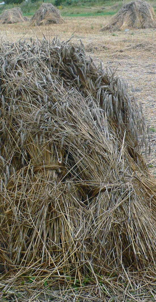 Während dieses Sommeraufenthalts sind die beiden bald wieder zu Andreas Lauritzen nach Morsum gefahren. "Ja, wir haben gedacht, die kommen bestimmt", kommentiert er deren Ankunft. Sohn Georg muss nach seinem Schuldienst gelegentlich bei der Ernte helfen. Karin begleitet ihn. Er bindet das geschnittene Korn (Getreide) geschickt mit einigen Halmen zu einem Bündel zusammen. 6 oder 8 davon werden später zu Hocken zusammengestellt, um das Korn vor dem Dreschen trocknen zu lassen. So hat man das schon immer gemacht. Auch jetzt, weil für den Binder keine Taurollen zu kriegen sind.