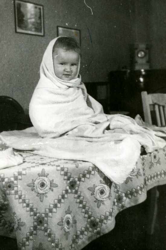 Morsum 1950. Sohn Ekkehard, 14 Monate alt, trägt einen Pullover aus Morsumer Schafwolle. Sie kratzt auf der Haut. Es bleibt ihm eine Wollallergie.