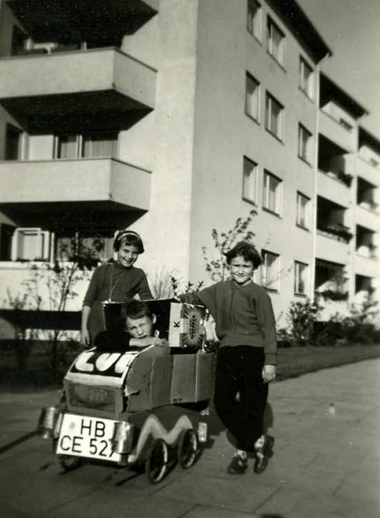 Bremen Vahr ca. 1958. Georg Lauritzen ist mit seinem blauen VW Käfer auf einer Ölspur ausgerutscht. Er war auf einer Wochenendheimfahrt von seiner neuen Arbeitsstelle bei Siemens in Kiel zu seiner Familie. Das Auto: Totalschaden. Georg unverletzt. Geblieben ist das Nummernschild, das von Sohn Ekkehard als Prunkstück für einen Nachbau auf dem Rahmen seines früheren Kinderwagens dient. Der Aufbau besteht aus einer Holzkiste und Pappkartons. Lui wurde der havarierte VW von Georg Lauritzen genannt. Fahrer der Seifenkiste ist Sohn Ekkehard, Daneben stehen seine Schwester und ein Nachbarskind.